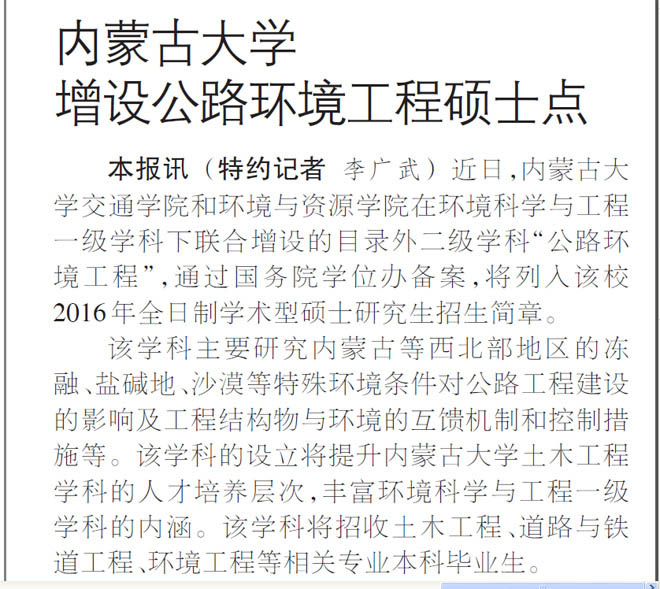 中國交通報:內(nèi)蒙古大學增設公路環(huán)境工程碩士點