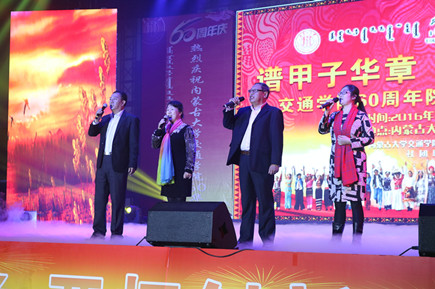 第三篇章“憶崢嶸歲月,展興業(yè)宏圖”,歌曲《光榮》為老師送上了殷殷祝福;舞蹈《來(lái)自西域的祝?!?,精巧的服飾,優(yōu)雅的舞蹈,給人以美的享受;小品《為交院干杯》,用詼諧幽默的語(yǔ)言訴說(shuō)了學(xué)院六十年的風(fēng)雨兼程;最后,鄒豪思,潘靜,穆懷旗,馬紅文四位老師為大家獻(xiàn)上歌曲《為內(nèi)蒙古喝彩》,歌頌了廣闊無(wú)垠的內(nèi)蒙古雄偉遼闊,見(jiàn)證著內(nèi)蒙古大學(xué)交通學(xué)院的崛起輝煌。