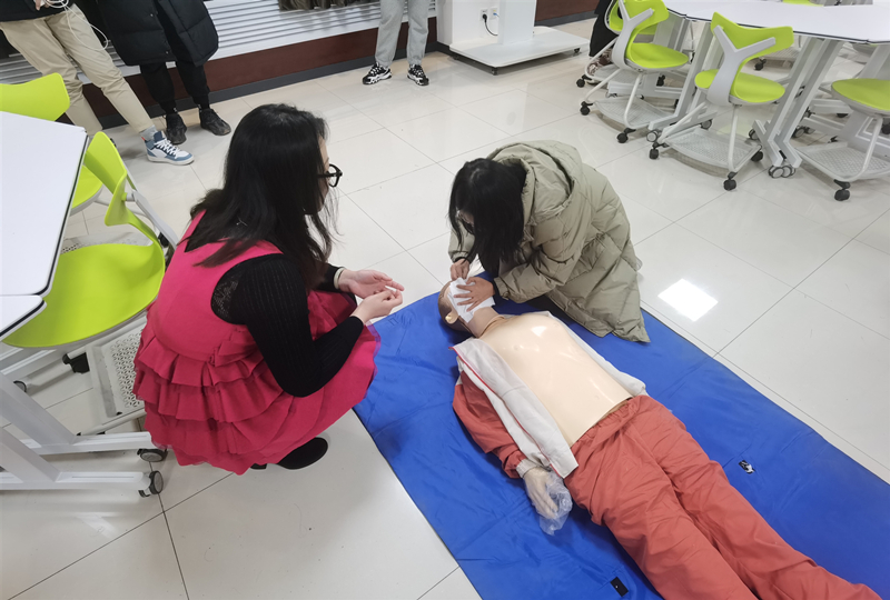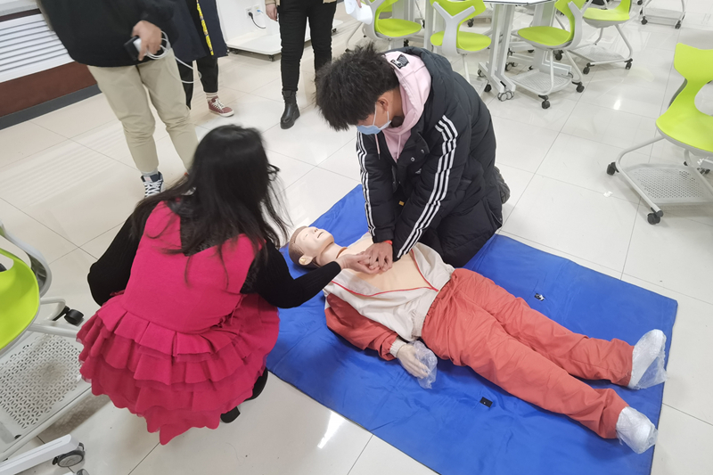 并就心肺復(fù)蘇的具體操作方法進(jìn)行了講解和示范,查看“患者”意識(shí)、觸摸頸動(dòng)脈、清除呼吸道異物、打開氣道、胸外心臟按壓、施行人工呼吸等。工作人員現(xiàn)場(chǎng)和師生進(jìn)行互動(dòng),部分師生在工作人員的指導(dǎo)下進(jìn)行了實(shí)操,初步掌握了心肺復(fù)蘇的基本技能。